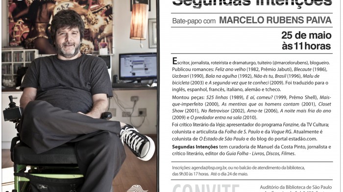 Marcelo Rubens Paiva é o convidado da edição de maio do ciclo de bate-papos Segundas Intenções. O encontro acontece no dia 25/5, sábado, às 11 horas, no auditório da Biblioteca de São Paulo...