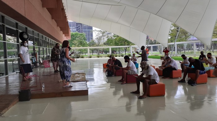 “Surpresa.” “Um espaço de liberdade.” “É um exercício de criatividade.” “Acolhimento, eu me sinto bem.”  “Fiquei muito feliz pois as atividades de sábado da minha querida bi...