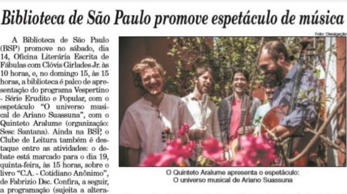 A Gazeta da Zona Norte publicou matéria sobre a programação dos próximos dias na BSP. A apresentação do Quinteto Aralume é um dos destaques. Confira a matéria, clicando aqui. [caption id="...
