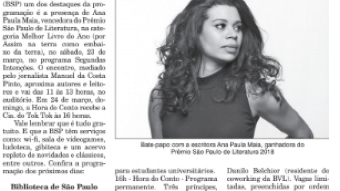 Na BSP, um dos destaques da programação do final de semana é a presença de Ana Paula Maia, vencedora do Prêmio São Paulo de Literatura, na categoria Melhor Livro do Ano (por "Assim na terra com...
