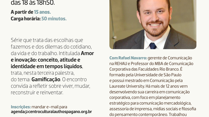 O Centro Cultural e de Estudos Superiores Aúthos Pagano promove em setembro a série de palestras Amor e inovação: conceito, atitude e identidade em tempos líquidos, que vão ser realizadas nas qu...